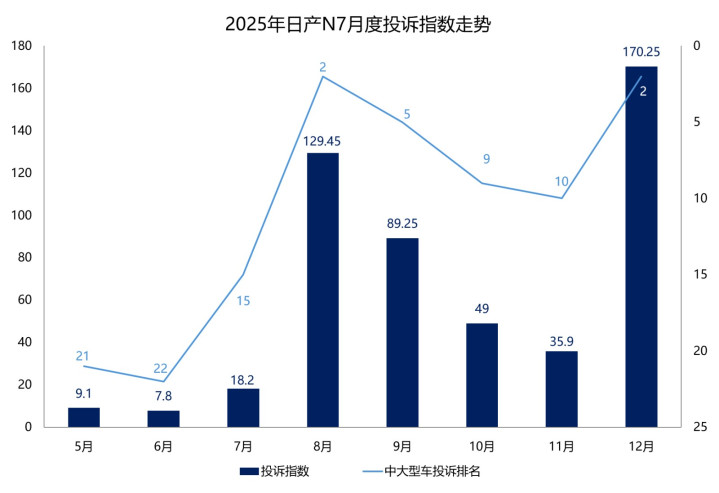 从月度走势来看,日产N7的投诉指数在上市后前3个月始终保持低位运行。到了8月,其投诉指数骤增至129.45,同步推动排名跃升至第2名,成了全年投诉热度的第一个高峰。此后的9月-11月,日产N7的投诉指数逐步回落。然而,其投诉指数在12月再度冲高至170.25,创下全年峰值。
